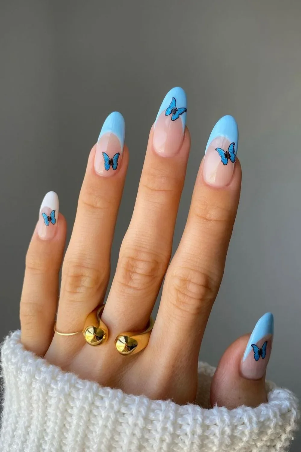 Butterfly Nails: Light blue nails featuring delicate butterflies are the perfect whimsical touch.