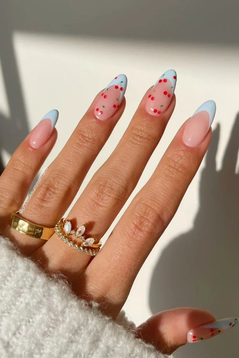 Cherry-Topped Blue: Fruit-inspired light blue nails with cherries bring a cute and playful vibe to your nails.