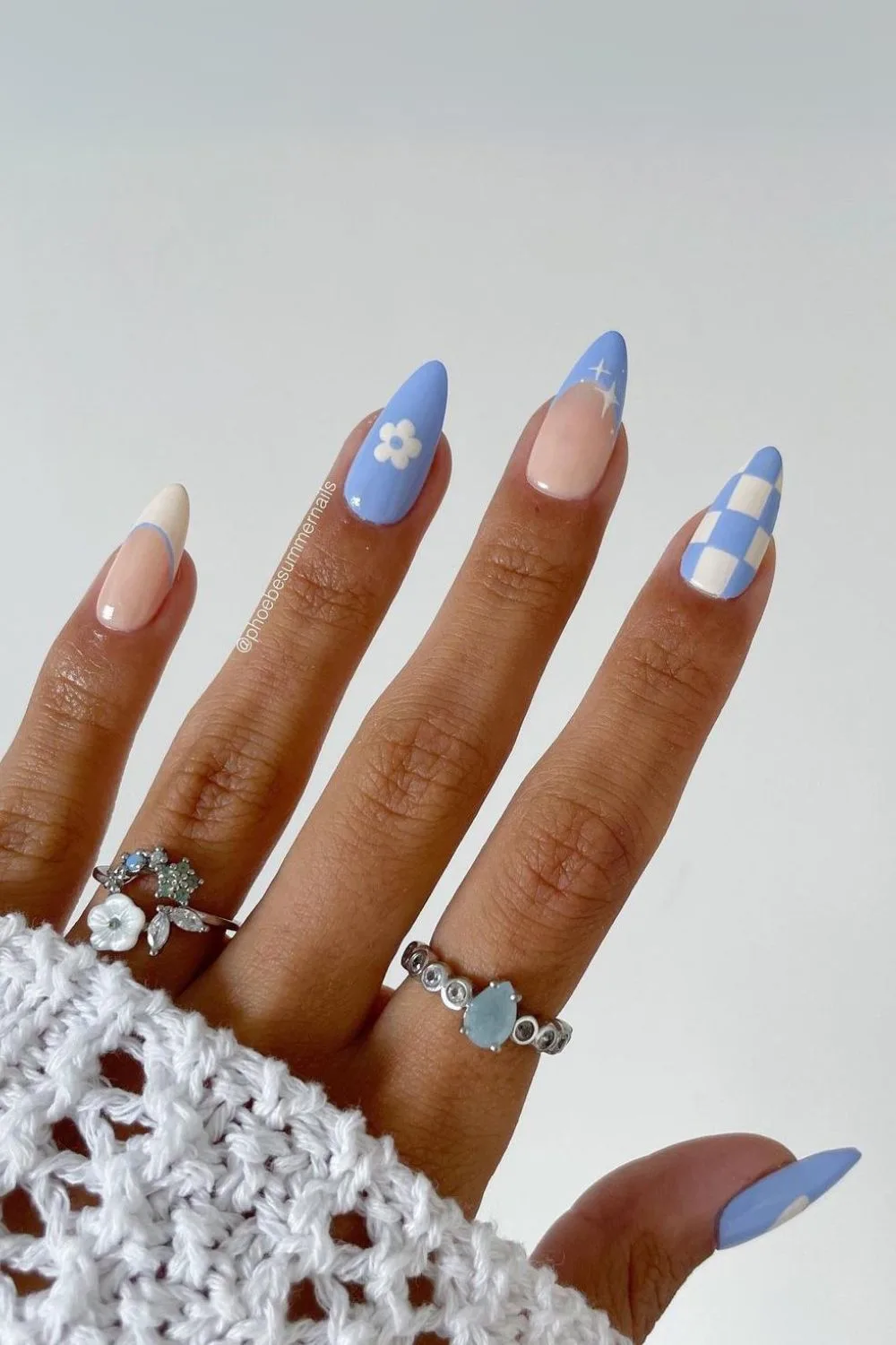 Mix-and-Match Nails: Mix up patterns with checkerboards and florals in light blue for a fun, eclectic style.