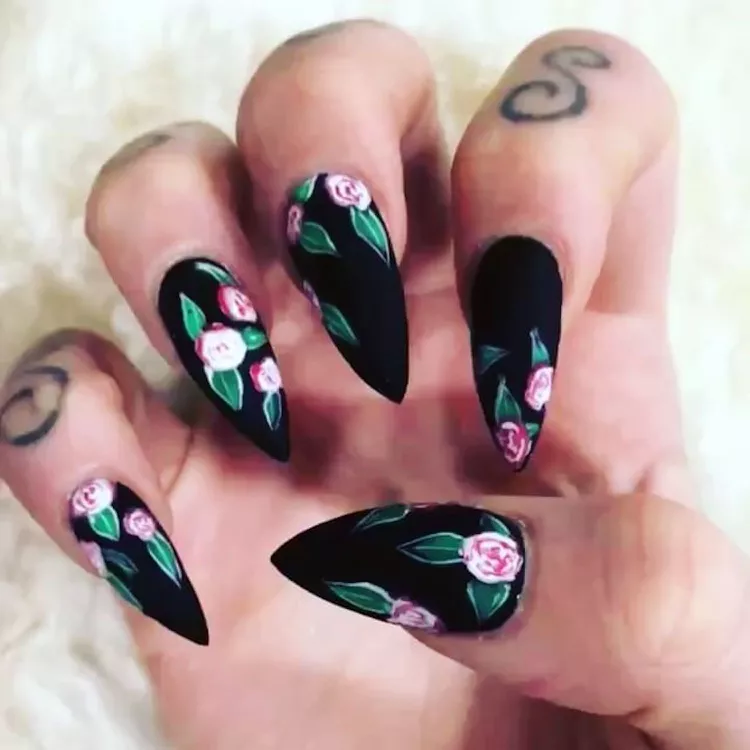 Craving a darker twist on pink and green? Ditch the pastels and embrace the gothic side! Opt for a sleek black base and get lost in the details of intricate, pink roses. This unexpected color combo adds a touch of romance without being overly sweet, making it perfect for both edgy black outfits and vibrant ensembles.