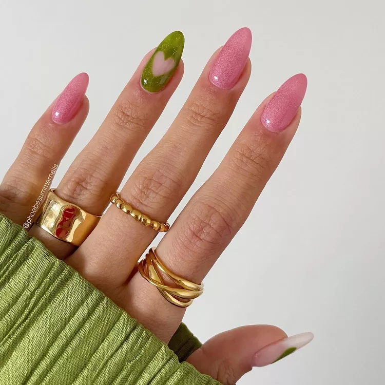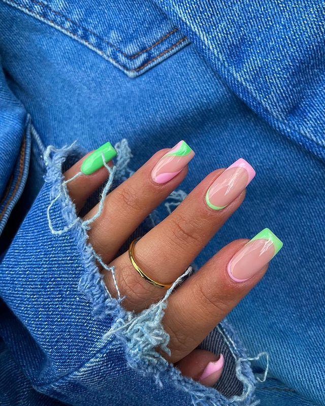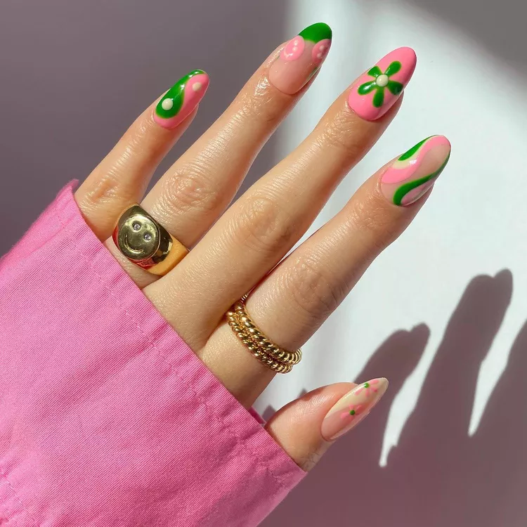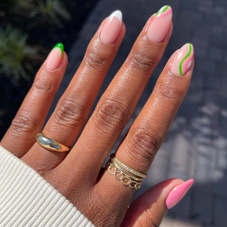 Imagine a lava lamp, but for your nails! This is such a fun and retro way to incorporate pink and green into your manicure. The great thing about this design is that it doesn’t require precision, so even if you make a mistake, it won’t be noticeable.