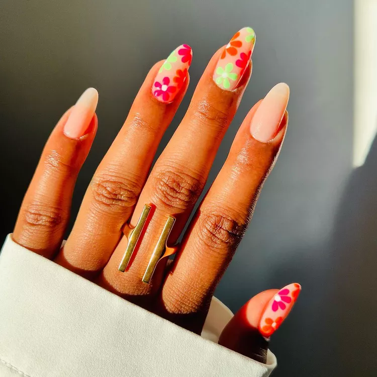 Pink and green burst onto the scene like a summer fruit basket when used at their most intense! This color combo is perfect for a floral nail art design that screams summertime fun. To keep the look wearable year-round, add some neutral accent nails. This way, you can enjoy the vibrant florals while ensuring the manicure stays fresh for weeks! For those with short nails, consider experimenting with the best summer nail designs for short nails, incorporating elements of this lively color palette for a playful and stylish look.