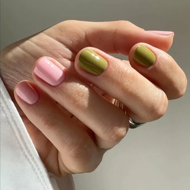 If you’re in a rush or want a quick way to achieve pink and green perfection, simply choose your favorite shades of each color. We recommend fresh milky and grassy hues for a vibrant look. Paint each color onto a few nails for an instant eye-catching statement.