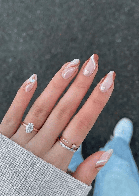NEUTRAL WHITE HEART AND SWIRL NAILS