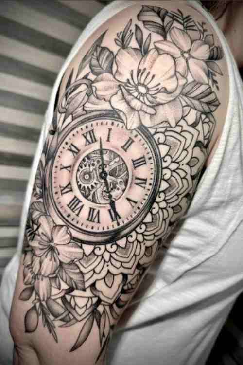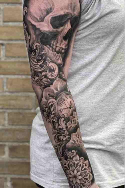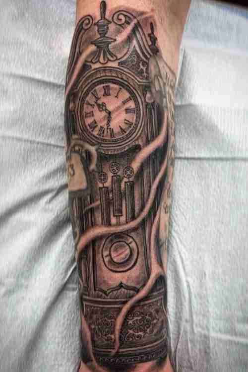 A clock tattoo symbolizes time, mortality, and life’s fleeting nature. Many men choose clock tattoos to commemorate special moments or personal milestones. For a striking look, consider adding skeleton details, roses, or a photorealistic design that spans the hand.