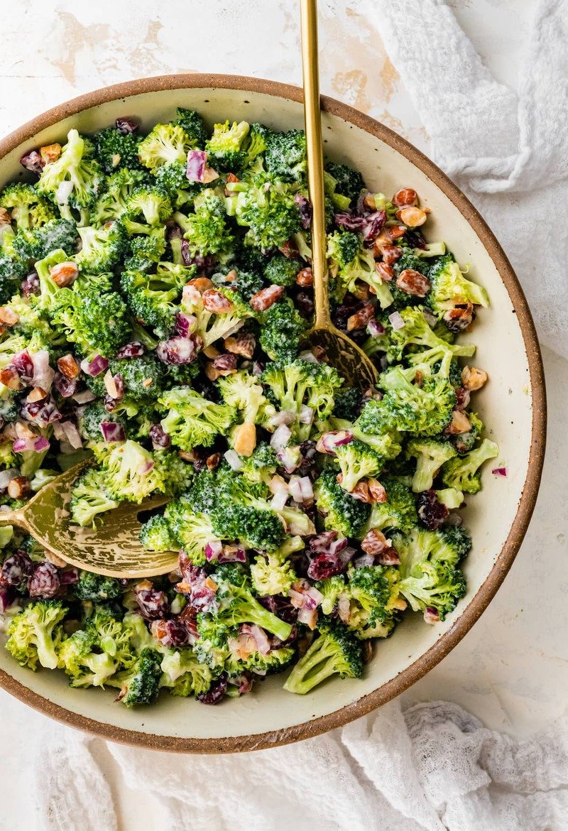 Broccoli Salad is one of my all-time favorite salad recipes. It combines fresh broccoli, crispy smoked bacon, sweet red onion, and crunchy sliced almonds, all tossed in a slightly sweet, creamy mayo dressing. It’s always a crowd-pleaser and one of the first dishes to disappear at potlucks, family gatherings, BBQs, and parties.