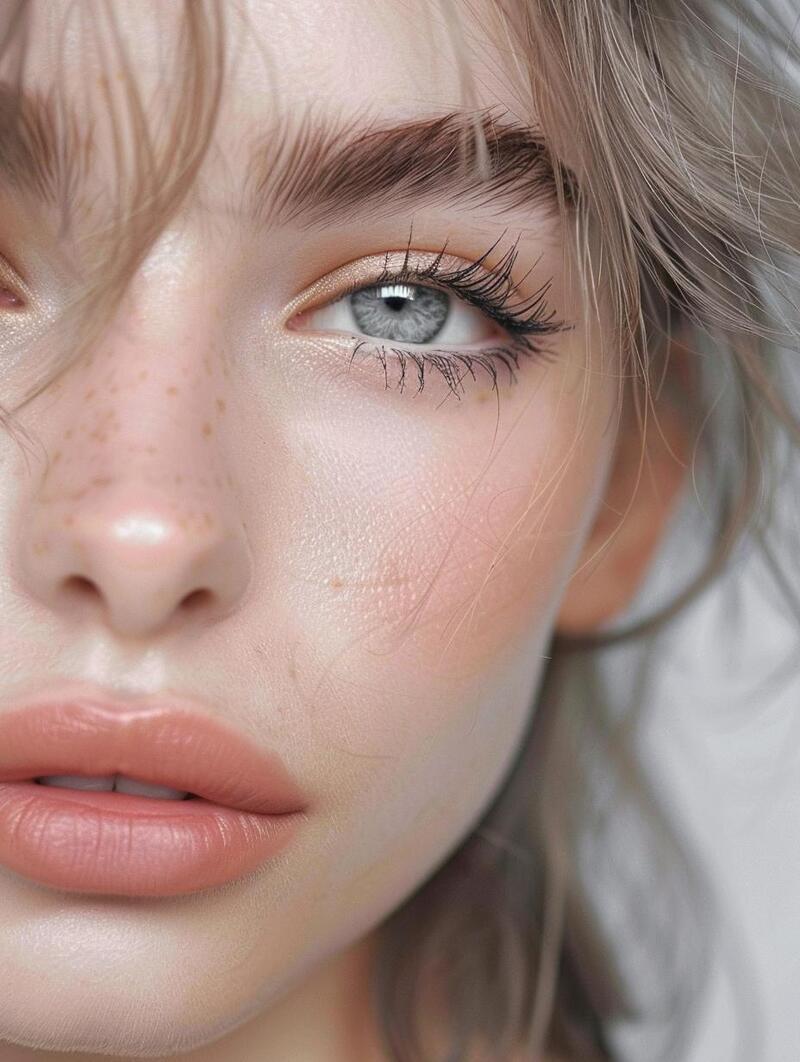 A face adorned with freckles is beautifully highlighted by a subtle enhancement of the eyes. The makeup remains minimal, embodying simple and natural beauty, with a soft brown eye pencil gently defining the eye shape.
