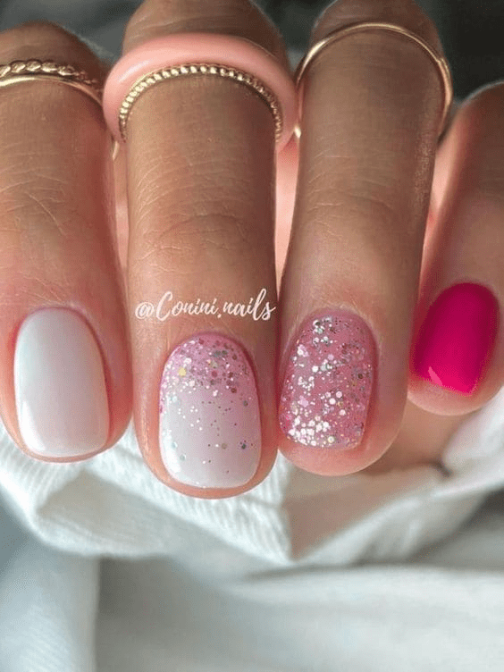 If bold, vivid colors aren’t your style, consider opting for pastels instead. These shades are colorful but offer a softer, more subdued look. Here’s a beautiful example of how to wear pastels: each nail is painted in a different shade, creating a lovely color combination ideal for spring and summer. You can either recreate this multi-shade look or use a single pastel color on all your nails.