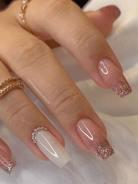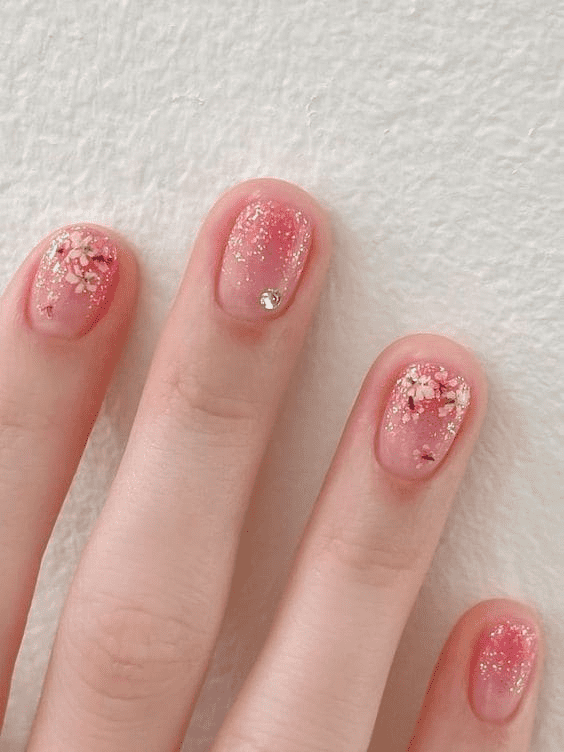 A touch of color can transform a bright manicure in a unique way. Instead of covering the entire nail with a solid shade, this design features a sprinkling of tiny butterflies, small flowers, and dots at the tips. It’s a charming, creative approach to adding color that’s both sweet and stunning.