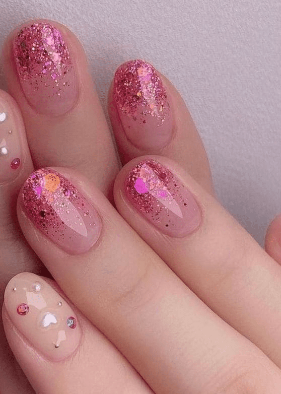 A chic way to infuse color into your nails is with an ombre effect. You can use any color combination for ombre, but pairing nude with bright hues creates a stunning look. Here’s a beautiful example: these nails are painted in a nude base, with each featuring a different ombre gradient in shades of pink, orange, and yellow. This design evokes thoughts of tropical vacations and refreshing cocktails. You can recreate this look with similar colors or use a single gradient shade across all your nails.