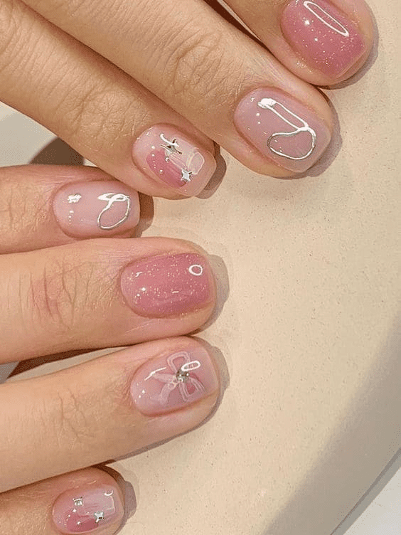 The mismatched nail trend continues to reign supreme, offering endless possibilities for creativity. This bold design perfectly captures the essence of the trend, blending French tips, nail cuffs, and geometric patterns into a harmonious yet unexpected look. There are no rules when it comes to mismatched nails, making it a fun and personalized style statement.