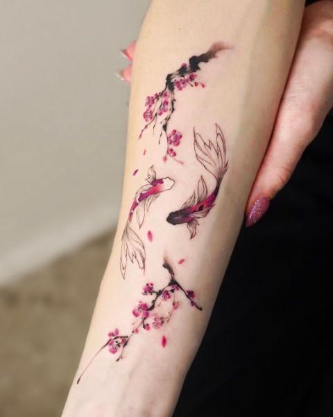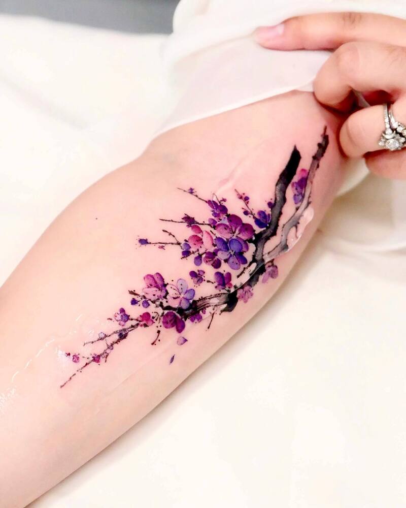 This cherry blossom tattoo elegantly captures the traditional meaning of transience. The watercolor technique enhances the beauty of the blossoms with its blend of delicate blue and purple hues, creating a soft, blurred effect on the arm.