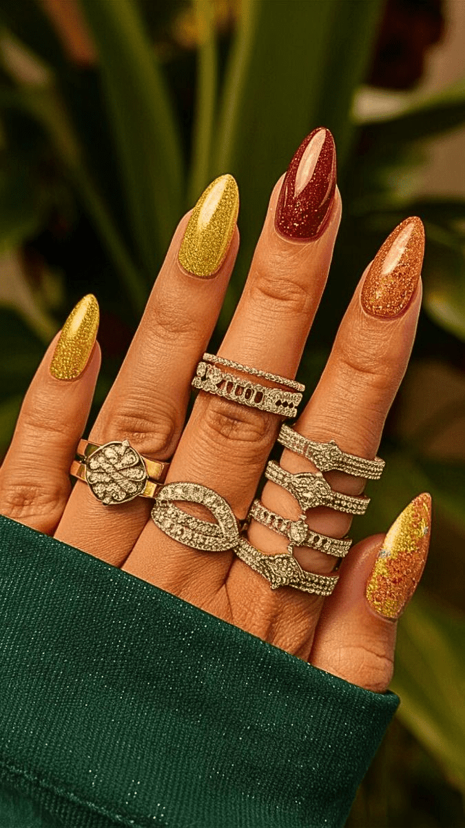 This playful birthday mani is all about mixing glam and fun! Most of your nails will sparkle with gold glitter, while the middle finger gets a pop of sunshine with a bright yellow French tip. Tiny blue and red dots add a playful touch, making this design perfect for a birthday celebration.