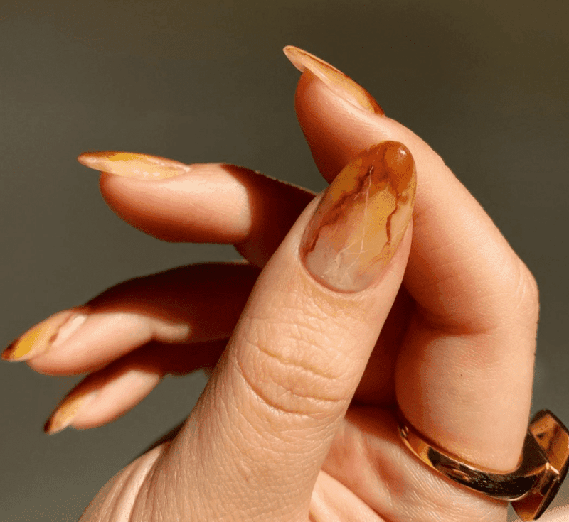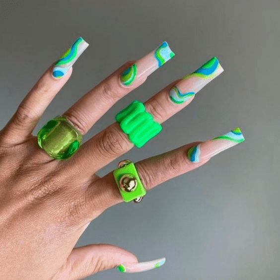 Party time! “Limelight Birthday” nails are all about standing out. Imagine sharp stiletto nails in a super fun lime green, like a highlighter come to life. To add some sophistication, the middle and ring fingers transform into mini works of art with a cool, swirling blue marble design. It’s the perfect mix of playful and fancy, making these nails the ultimate birthday statement.
