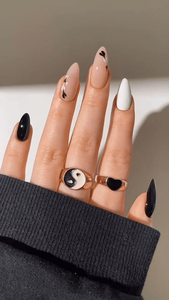 Birthday nails that are both fancy and fun! These are shaped like almonds and painted a smooth, milky white that looks really classy. But the real star is the ring finger, which has a beautiful flower design painted on it. It’s a perfect way to celebrate your birthday with a touch of elegance and whimsy.
