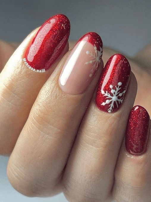 Calling all birthday queens with a love for sparkle! This almond-shaped design is all about celebrating with a touch of winter magic. Imagine a base of soft pink that lets the festive red glitter French tips truly shine. But wait, there’s more! Delicate white stars and tiny snowflakes sprinkled across the nails add a whimsical touch, making this mani a delightful way to celebrate your birthday with both elegance and festive cheer.