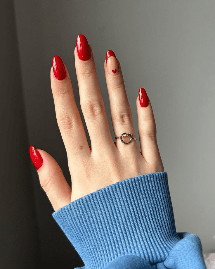 A captivating short round nail design that embodies romance and joy. Each nail features a vibrant glittery red base, while the ring finger stands out with a lovely pink base embellished with a delicate heart shape. This nail art adds a touch of love and sparkle to your birthday celebration, making a statement of heartfelt glamour and festive charm.