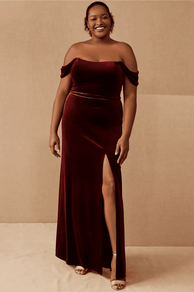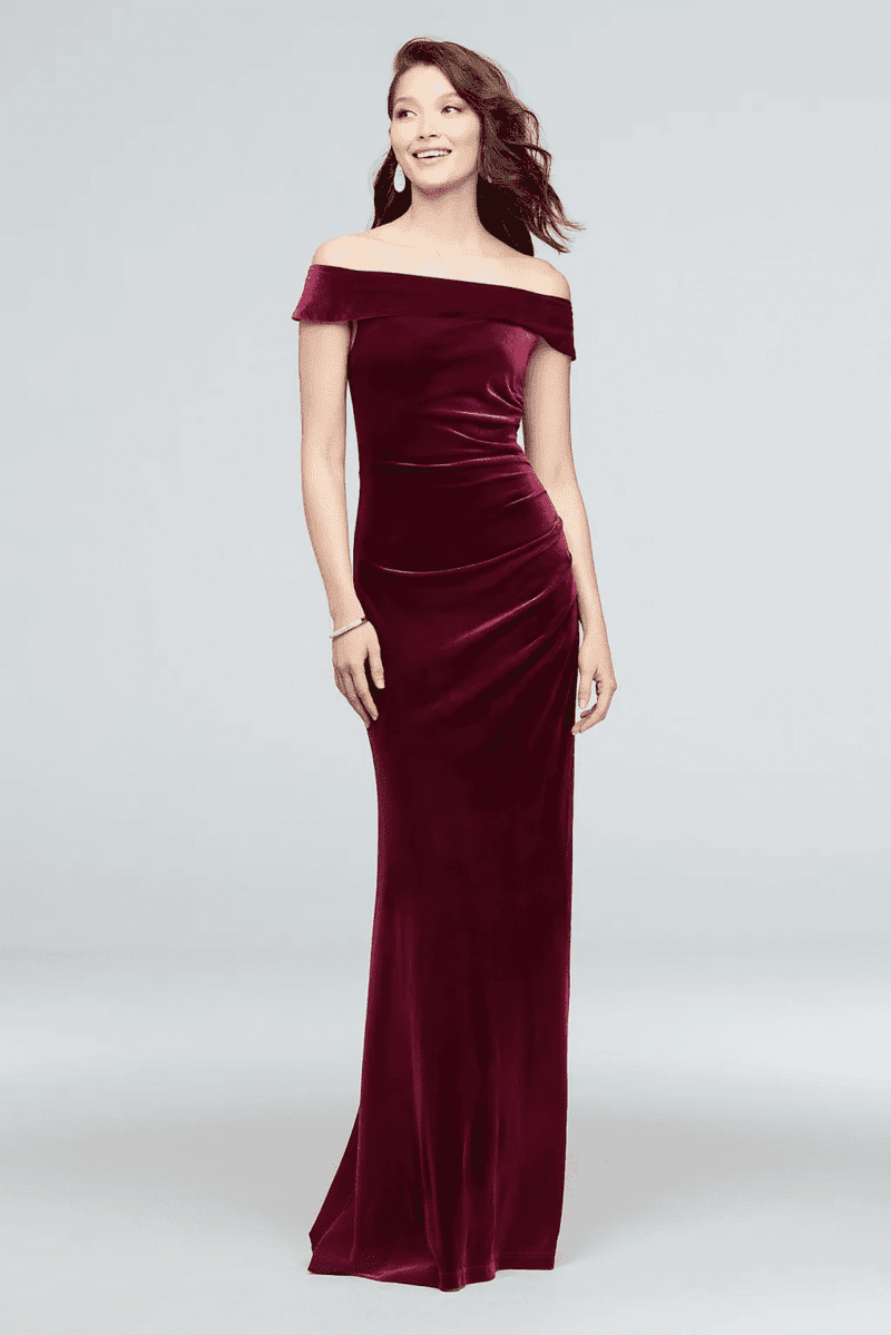 OFF-THE-SHOULDER VELVET BURGUNDY BRIDESMAID DRESS