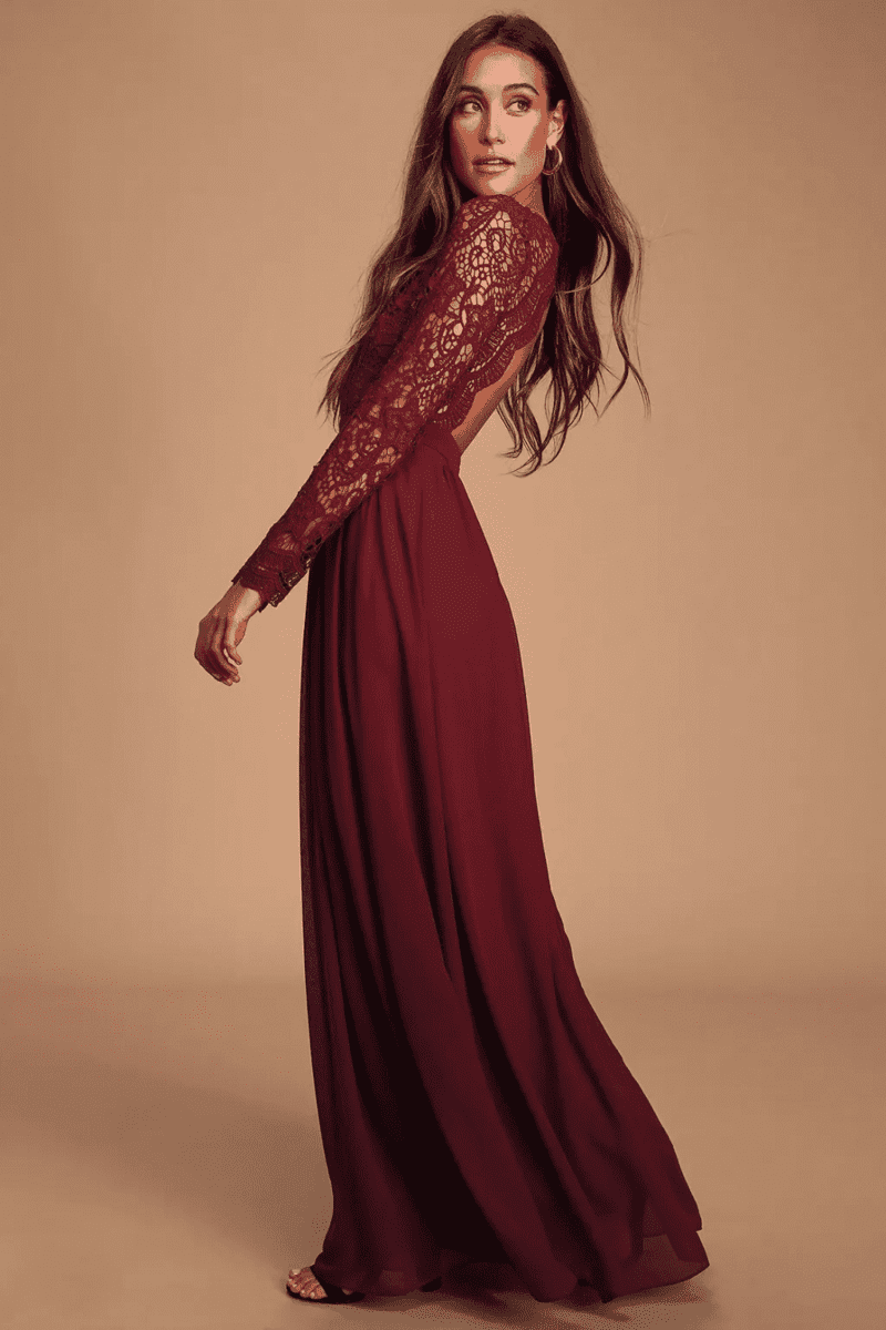 The combination of luxurious lace and rich burgundy creates a look that’s both sophisticated and undeniably beautiful. The long sleeves, crafted from delicate lace, add a touch of coverage and formality, perfect for a fall or winter wedding. The lace can vary in detail, from intricate floral patterns to more modern geometric designs. Regardless of the style, the lace adds a touch of texture and visual interest, elevating the dress beyond a simple burgundy gown. The long sleeves balance the silhouette beautifully, complementing flowing skirts or more fitted styles. Paired with a simple burgundy bodice or a sweetheart neckline with illusion lace details, this dress offers a timeless and unforgettable look for your bridesmaids. They’ll feel confident, elegant, and perfectly in tune with the romantic mood of your special day.