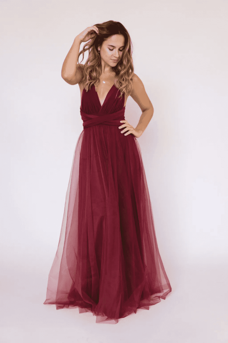The Burgundy Infinity Dress offers a unique and adaptable option for the wedding guest who wants to look and feel their best. This ingenious dress is crafted from a luxuriously soft and stretchy fabric that drapes beautifully and flatters a wide range of body types. The key feature lies in its infinity design – essentially a long piece of fabric with two long straps. This allows for endless styling possibilities! Wrap, twist, and tie the straps to create a variety of necklines, sleeve styles, and hemlines. Want a classic halter neck? A one-shoulder silhouette? A flowing skirt with a thigh-high slit? The infinity dress transforms to your whim. This versatility makes it perfect for a variety of wedding settings, from a formal ceremony to a more casual outdoor celebration. Plus, the comfortable fabric ensures you’ll be dancing the night away without feeling restricted. With its endless styling potential and flattering fit, the Burgundy Infinity Dress is a wardrobe chameleon that will become your go-to for any special occasion.