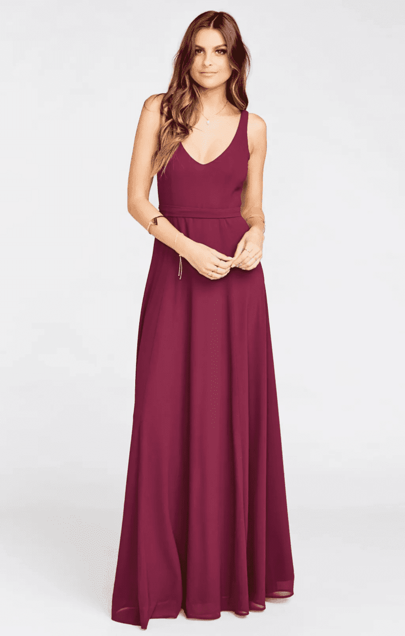 This dress offers versatility in its design details. Whether it features a simple spaghetti strap design, a romantic V-neckline, or a delicate illusion lace bodice, the long crepe wine bridesmaid dress promises a look that’s both classic and undeniably flattering for your entire bridal party.