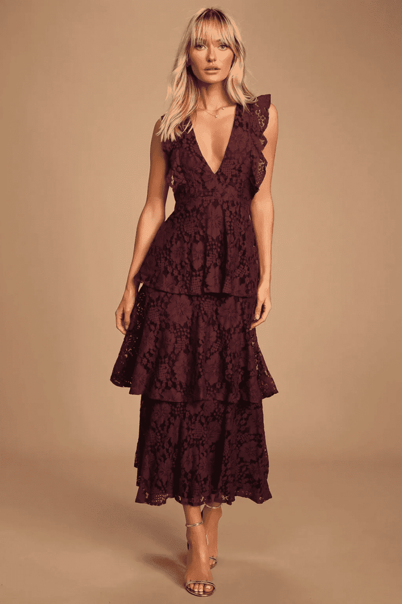 This style is perfect for a variety of wedding settings. It can be dressed up with statement jewelry and heels for a more formal occasion, or kept casual with sandals and a simple bag for a daytime ceremony. The tiered skirt offers a comfortable fit that flatters a variety of figures, while the flowy silhouette allows for uninhibited movement on the dance floor. With its unique combination of elegance and whimsy, the ruffle tiered maroon dress is a perfect choice for the guest who wants to make a memorable impression at any wedding celebration.