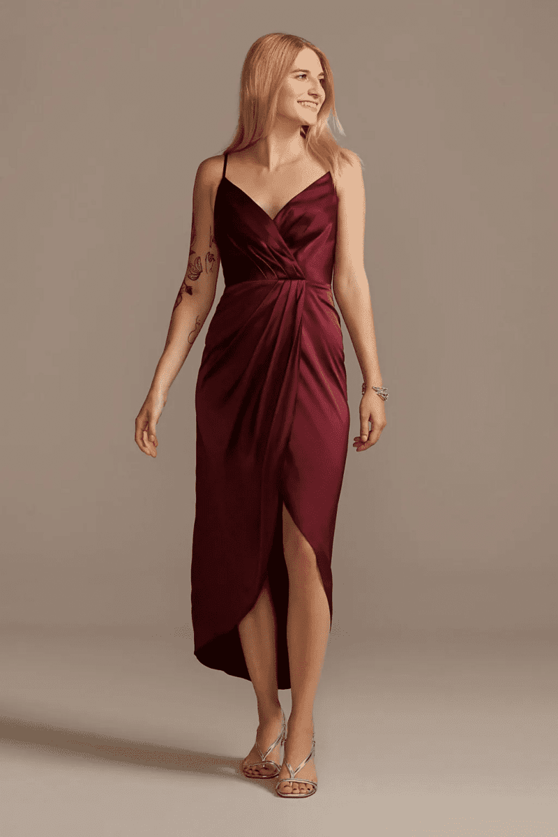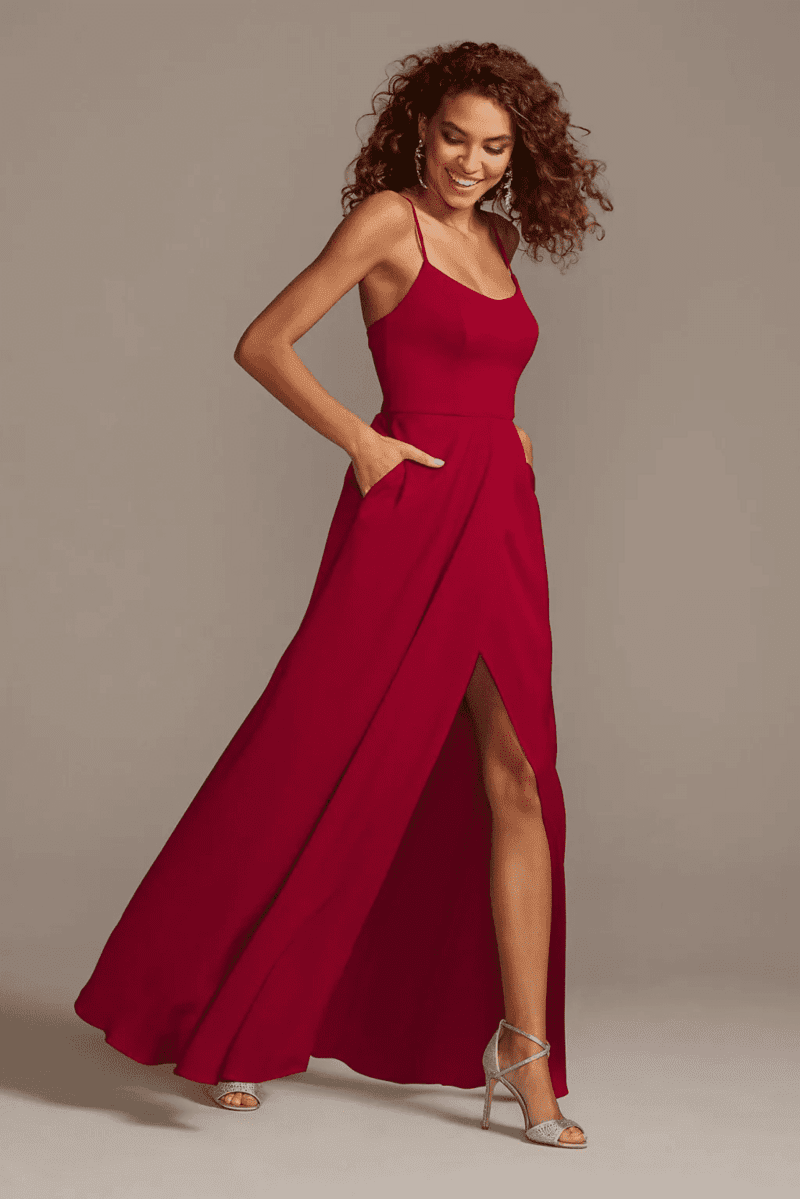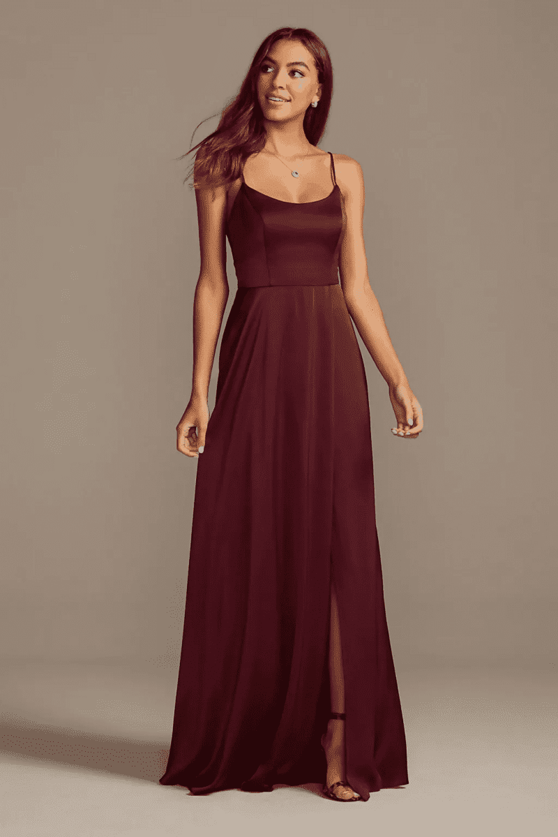 For a timeless and elegant look, consider the Celebrate DB Studio Crepe-Back Satin Spaghetti Strap Bridesmaid Dress by David’s Bridal. This dress combines the luxurious drape of crepe-back satin with the delicate touch of spaghetti straps, creating a silhouette that’s both flattering and sophisticated. The clean lines and modern scoop neckline offer a touch of contemporary flair, while the adjustable straps ensure a perfect fit. Plus, convenient side pockets add a touch of practicality without compromising the dress’s overall polished look. Available in a wide range of colors including, of course, a gorgeous burgundy, this dress is a versatile choice for bridesmaids or wedding guests alike.