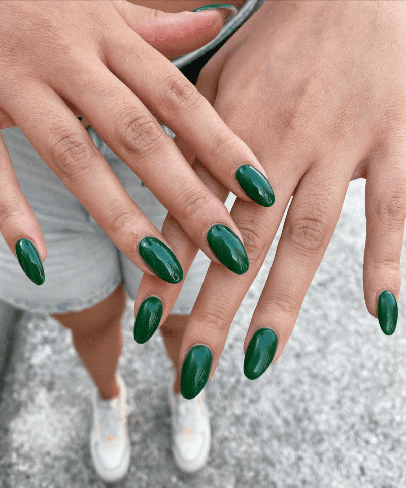 Dive into the world of untamed creativity with uniquely shaped green nails! This option is all about pushing boundaries and expressing yourself through unconventional nail shapes. Ditch the classic round or square and explore a world of possibilities. Go for dramatic stiletto nails that elongate your fingers, playful coffin nails with a tapered tip, or even edgy almond nails that combine a pointed tip with a slightly rounded edge. The green polish itself becomes a canvas for your unique style. Embrace an ombre effect where the green transitions from light to dark as the nail shape tapers. Play with negative space by leaving the tips clear on a stiletto nail with a green base. No matter your choice, uniquely shaped green nails are guaranteed to turn heads and showcase your individuality in a bold and beautiful way.