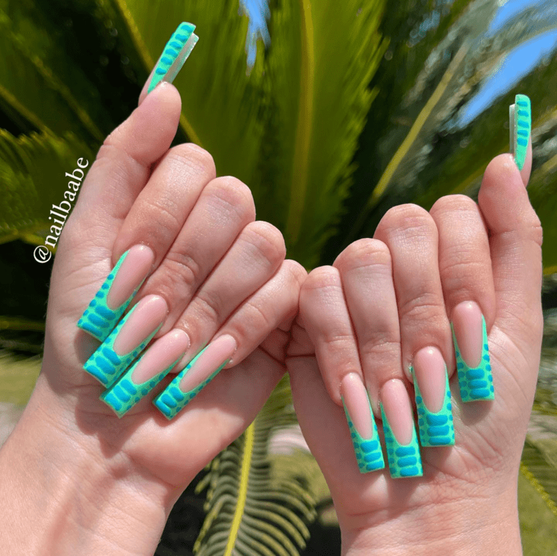Take the classic French manicure and give it a summery twist with a green twist! This elegant design offers a fresh take on a timeless favorite. For a subtle approach, opt for a soft, creamy green tip that complements your natural nail bed color. For a bolder statement, choose a vibrant emerald or lime green for the tips. You can even create a color gradient, where the green tip transitions to a lighter shade towards the base of your nail. No matter your preference, a green French manicure adds a touch of sophistication and elegance to your summer look, perfect for any occasion.