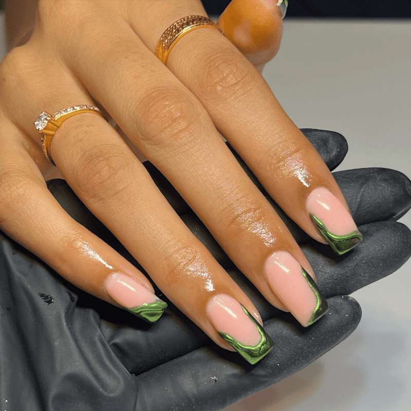 While this nail design doesn’t necessarily require green polish, it can be a fantastic complement to many of the green shades we’ve mentioned. Chrome tips add a touch of modern sophistication to any manicure. The metallic shine creates a striking contrast against a colorful base, drawing the eye to your fingertips. You can opt for a classic chrome finish in silver or gold, or get playful with colored chrome pigments that match or complement your green base shade. This eye-catching detail can elevate a simple green manicure or add a touch of glam to a more elaborate design. Chrome tips are versatile and perfect for anyone who wants to add a touch of modern flair to their summer nails.