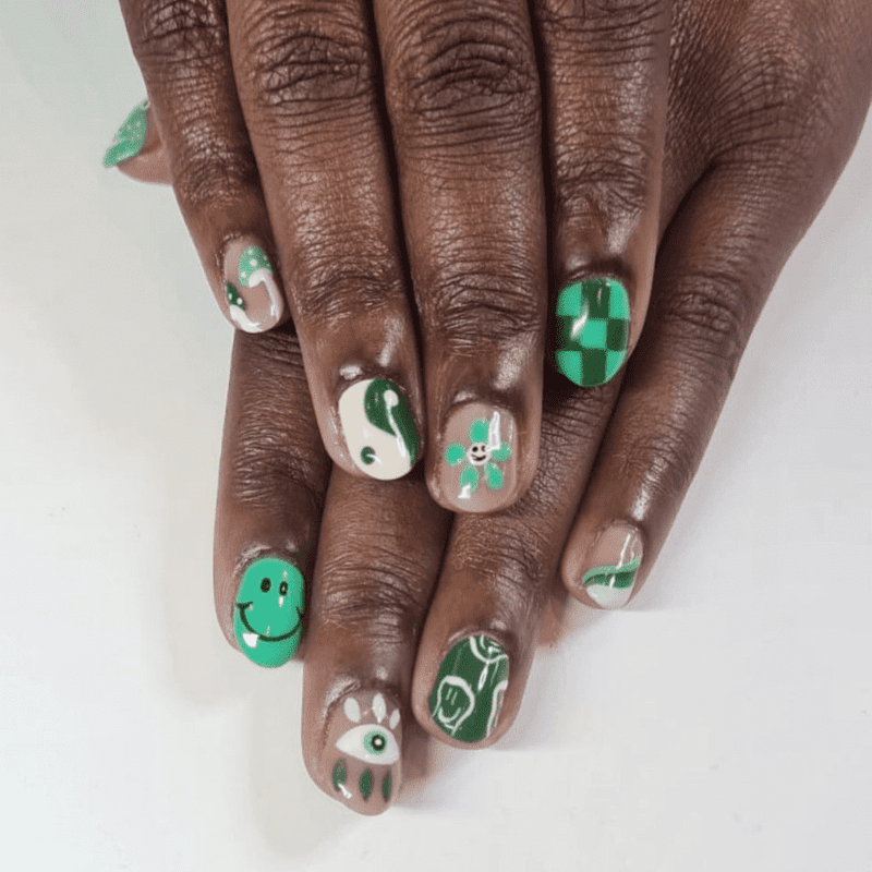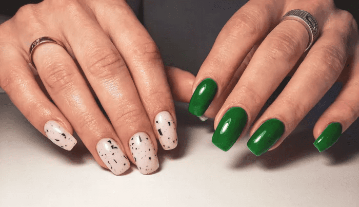 MISMATCHED GREEN AND SPECKLED NAILS