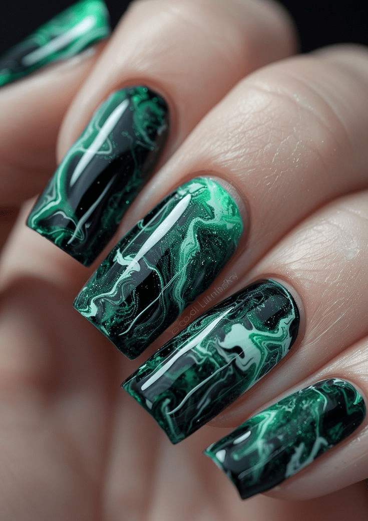 There are a few ways to achieve this look. For a classic approach, use a nail art brush to create swirling lines in different greens on a neutral base coat. If you’re feeling adventurous, try a water marbling technique. Drip different shades of green polish onto the surface of water, then gently dip your nail into the colorful film to create a unique, swirled pattern.
