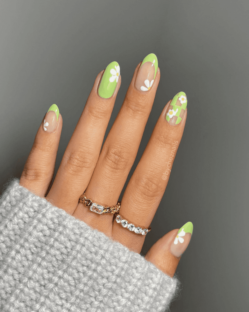 Taking the classic checkered pattern and infusing it with summery green creates a manicure that’s both playful and chic. You can opt for a bold contrast with a dark green and white checkerboard, or go for a more subtle look with lighter shades of green. If you’re feeling adventurous, try mixing different green hues for a multi-dimensional checkered design. This playful pattern is perfect for adding a touch of personality to your summer look.