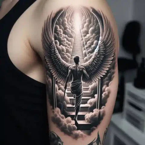 An angel tattoo on the shoulder is a popular choice for men seeking to convey spirituality and protection. The design may feature a full-body depiction of an angel or focus solely on the wings. This tattoo is an excellent option for those looking for a powerful yet meaningful design, making it one of the most significant simple shoulder tattoos for men.