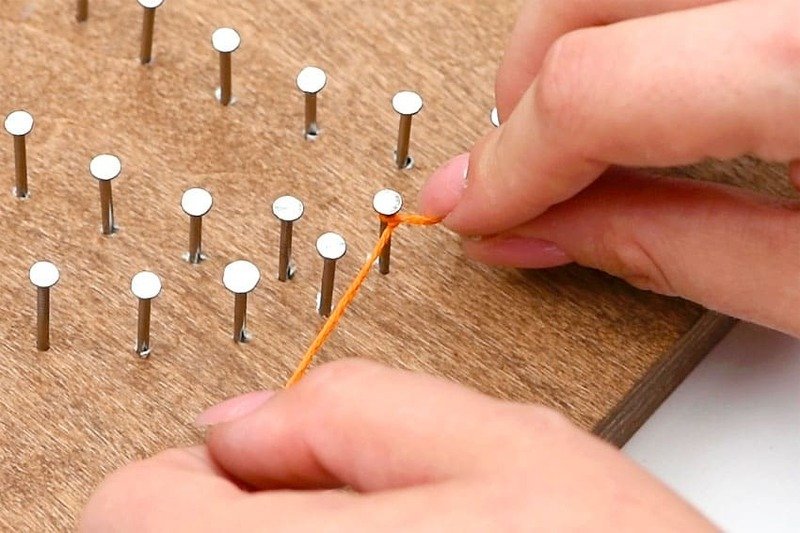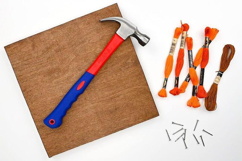 Begin by tying the pumpkin orange embroidery floss to one of the nails with a double knot, leaving a 1 to 2-inch tail of string at the end.