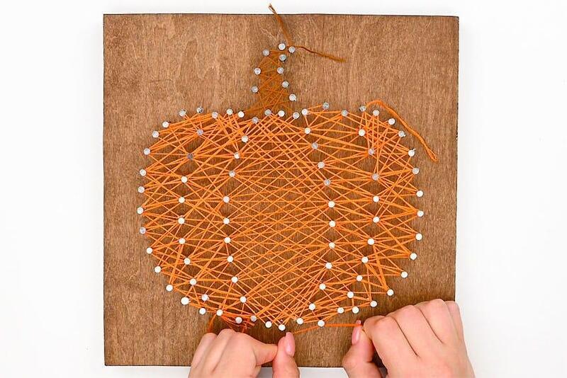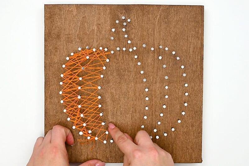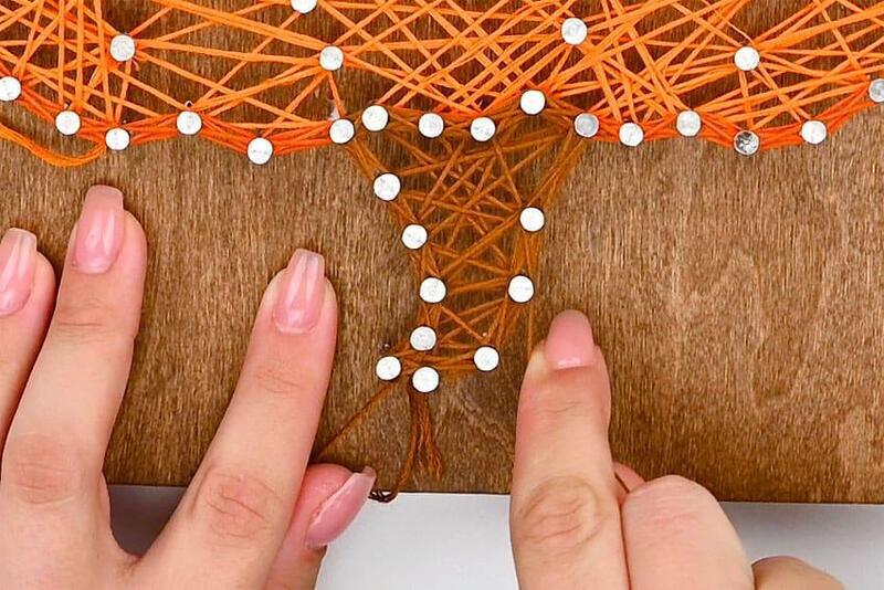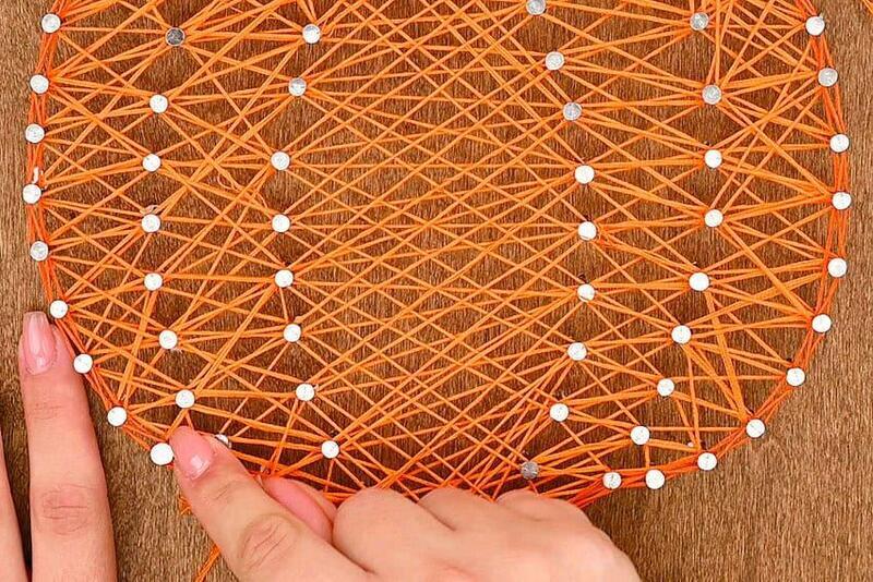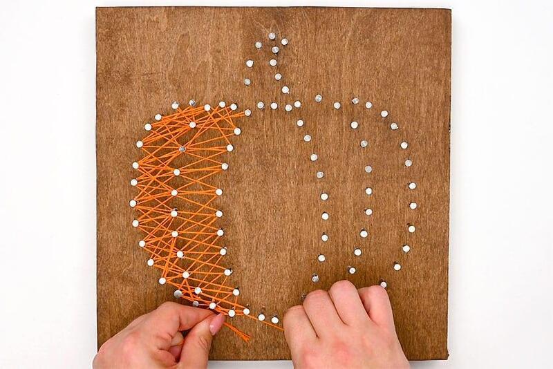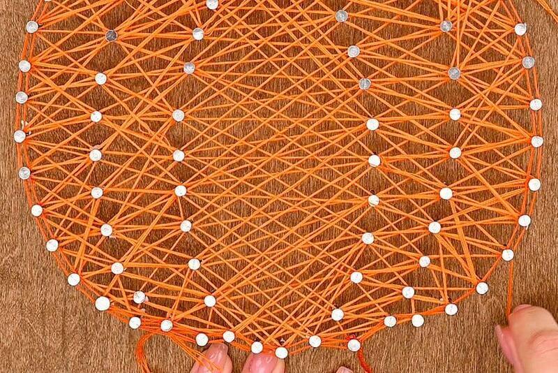 Create a similar border on the pumpkin stem using the brown thread. Repeat the process of wrapping around each side of the nails and zigzagging between them in both directions. Once you’re satisfied with the look, cut the string and tie it off securely.