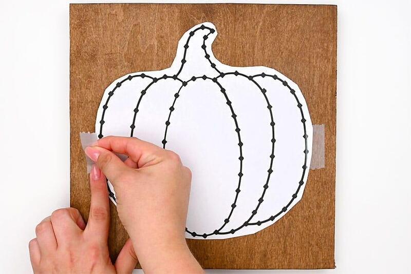 Secure the pumpkin template to the center of your wood board with tape to hold it in place. You can use plain wood or, for added effect, stain the wood beforehand as we did.