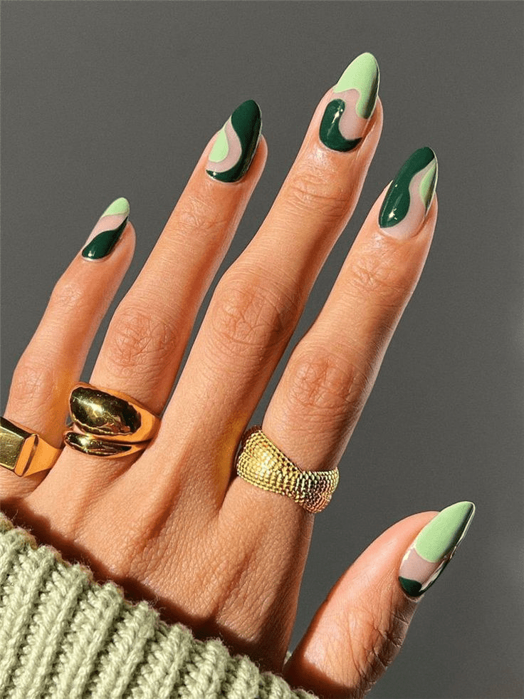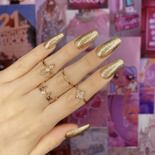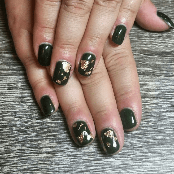 This manicure goes beyond the usual sparkly accent by combining three elegant matte green nails with two dazzling gold, sparkly nails. The meticulous arrangement achieves a design that radiates a special-occasion-worthy allure while maintaining versatility for daytime wear. The strategic positioning of the gold, sparkly nails adds a touch of glamour and festive charm, striking a harmonious balance between matte sophistication and sparkling allure.