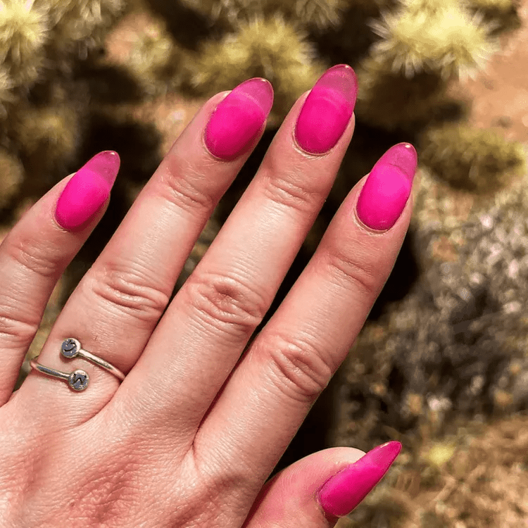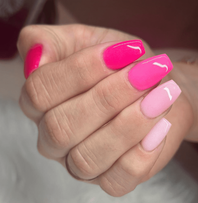 If you haven’t embraced the Barbiecore trend yet, here’s a compelling one. This chic and playful nail style effortlessly captures the essence of the Barbiecore aesthetic, adding a touch of whimsy and vibrancy to your overall look. The translucent and glossy finish of the pink jelly dip nails creates a modern and stylish appearance, perfect for making a bold fashion statement.