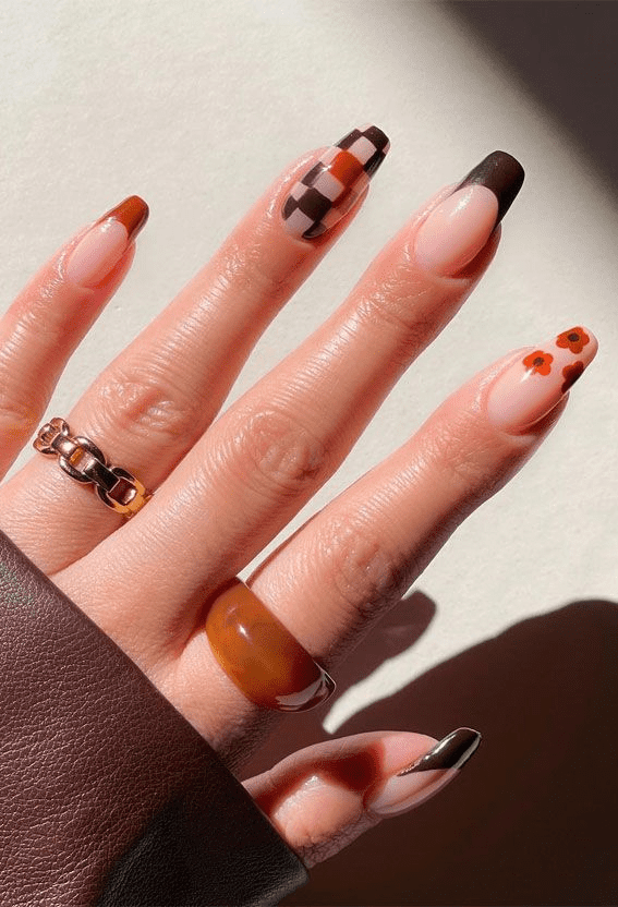 In this tonal nail design, the creative use of two different shades of brown dip powder results in a stunning array of checkerboard patterns on each nail. The intricate and diverse arrangement not only captures the eye but also adds a dynamic and visually captivating dimension to the overall aesthetic.