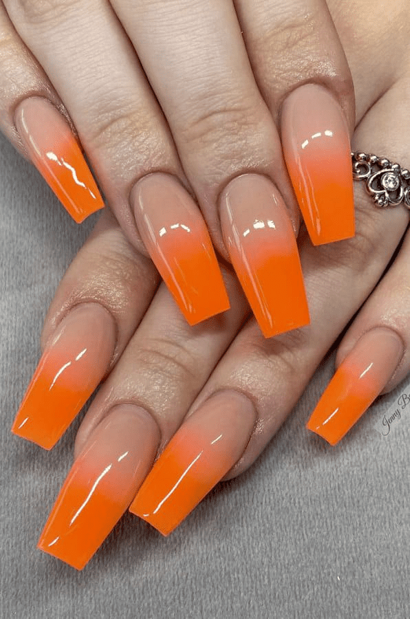 Create sunset ombré nails using shades of red, pink, orange, or yellow. This sunset manicure, featuring a gentle fade using pale yellow and tangerine orange, is particularly appealing. Achieve a stunning look by blending a fiery orange base into a deep coral tip, reminiscent of the warmth of a scorching desert sunset.