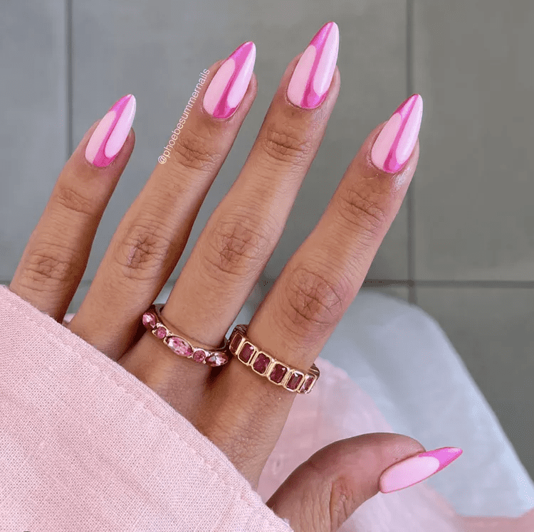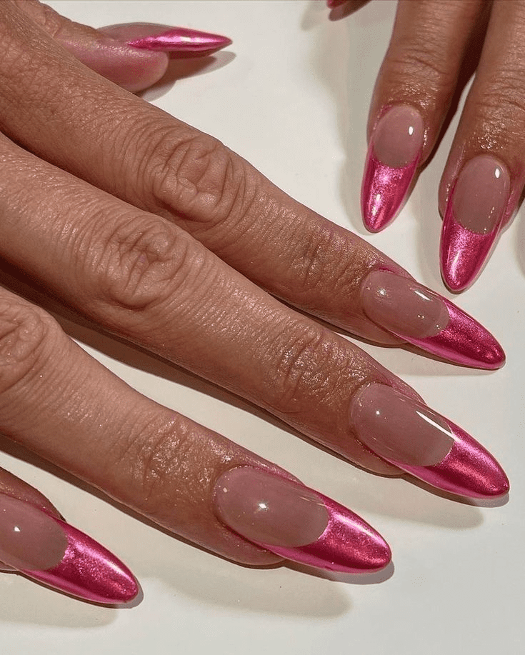 Dive into the world of playful contrasts with the halfsies pink chrome mani! This design takes a simple approach yet packs a powerful punch. Imagine dazzling hot pink chrome nails on half your hand, captivating all eyes, while the other half boasts a soft, glossy baby pink finish. The contrasting textures and shades create a visually stunning look that’s both unique and undeniably eye-catching.