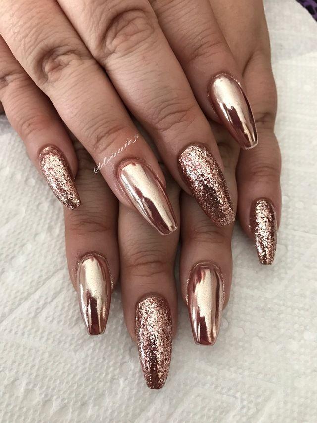 This nail design takes the metallic allure of rose gold and adds an extra touch of glamour with strategically placed glitter. The result is a stunning and sophisticated look that effortlessly combines the richness of rose gold with the sparkle of glitter.
