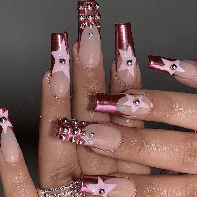 Unleash your inner rockstar with this maximalist pink chrome mani! This design isn’t for the faint of heart – it’s a dazzling triple threat that guarantees to turn heads. Imagine a base of captivating pink chrome, adorned with classic French tips for a touch of timeless elegance. But that’s just the beginning! Shimmering silver appliqués and dazzling star designs are then layered on top, creating a truly celestial spectacle. These pink chrome nails don’t just shine, they shoot for the stars, making a bold and unforgettable statement.