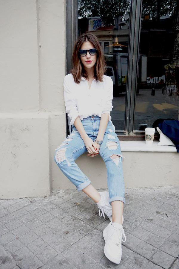 Imagine brunch with friends on a sunny weekend. Slip into your favorite distressed jeans and pair them with your white button-up shirt. Roll up those sleeves, add some white sneakers, and you’re ready for a casual, stylish outing.
