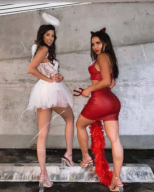 Next up, we have two timeless college Halloween costume ideas: an angel and a devil. The angel costume is all white and charming, while the red devil outfit is bold and edgy. You can pair up with a friend to complete the duo or choose to go solo as either the angel or the devil. This versatile option is perfect for a quick and easy last-minute costume choice!