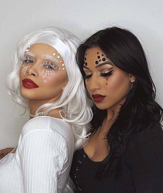 Last on our list of college Halloween costumes is a striking black and white look. One person wears all white, while the other opts for black. Both have their faces decorated with pearls or rhinestones and feature web designs. This unique idea lets you showcase either your light or dark side this Halloween, making it a memorable and versatile choice.