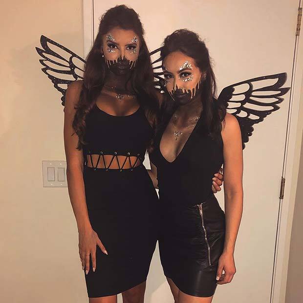 Next, we have a dark twist on angel costumes. Both costumes feature black outfits with a striking black dripping face illusion, completed with black wings. This look is perfect for showcasing a more mysterious or edgy side this Halloween. You can find wings online and check out dripping makeup tutorials to achieve the complete effect.
