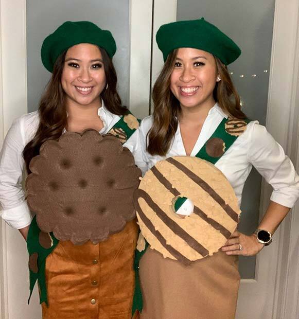 If you’re after a more unique costume, consider dressing up as Girl Scout cookies. These two are sporting scout uniforms with cookies featured prominently on the front. It’s a cool and quirky idea, perfect for those who want to celebrate Halloween in a fun and non-scary way. You can recreate this look or choose your favorite cookie to feature on your costume.