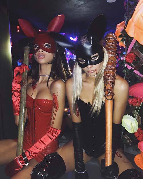If you want to make a statement this Halloween, consider this standout costume idea: Halloween bunnies with a fierce twist. One bunny sports a black costume, while the other goes for red, both featuring bats and blood for a dramatic effect. You can recreate this look with a friend, each choosing a different color, or go solo as one of the bold bunnies.
